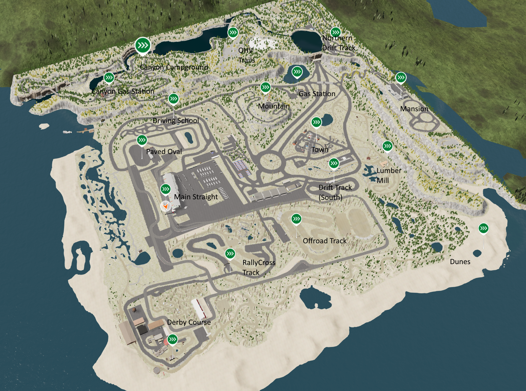 The main focus of the map is the racing circuit named Xero Speedring with 5 different layouts (Full, GrandPrix, Short, Classic Full, Classic Short). This circuit was built in the 1980s after the local Airport was shut and a bunch of land was available for use and cheap to buy. As a result, the track has a few fairly long straights but also some more street circuit-type aspects as you get closer to the warehouses in the far corner of the track.